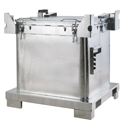 Materiál - Oceľový plech Objem - 800 l Hmotnosť - 190 kg Nosnosť - 1 200 kg Šírka - 1 200 mm Hĺbka - 1 000 mm Výška - 1 240 mm - Kontajnery na pastovité látky. - Atest ADR...