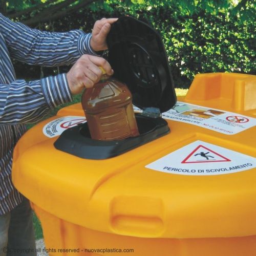 Veľkokapacitný zberný kontajner určený výhradne na zber použitého oleja v PET fľašiach - bez priameho vlievania oleja.