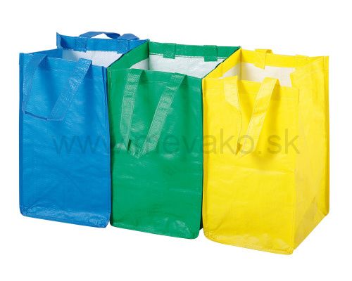 Dĺžka - 230 mm Šírka - 230 mm Výška - 400 mm Hmotnosť - 0,25 kg Set 3 tašiek na triedený odpad, český text. Vyrobené z netkanej textílie potiahnutej polypropylénom (PP). Tašky...