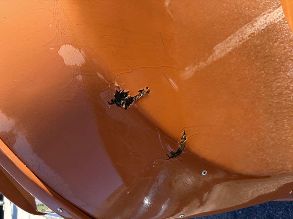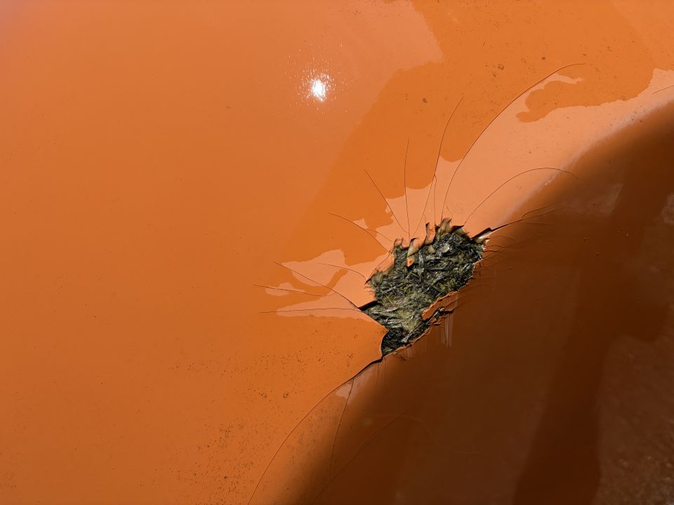 Sklolaminátový kontajner ma poškodenie (viď obrázok) ktoré však nemá žiaden vpliv na používanie.